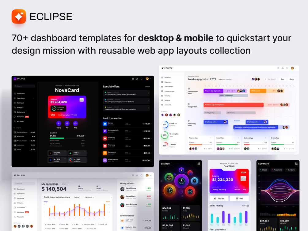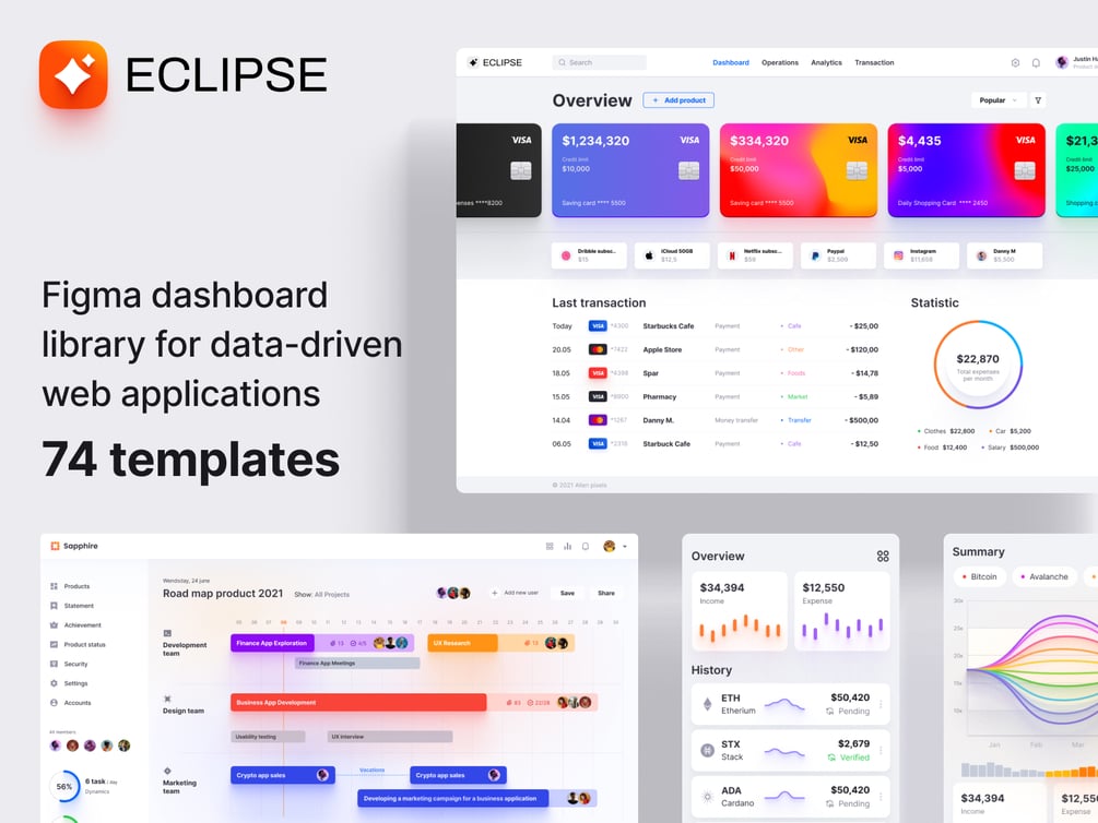 Eclipse UI kit - 1100+ variants of 80 components served as Figma dashboard library for data-driven web applications. Powered by auto-layout. Supercharged by Figma's variants. Eclipse UI kit is easy to customize. Contains 74 detailed desktop & mobile templates for a quick start. This well-organized library either helps to learn Figma and take your UI design skill to the next level!