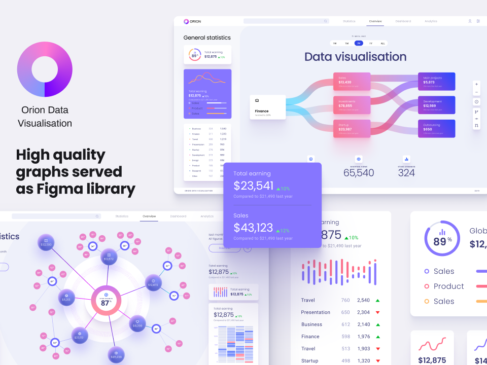 Orion UI kit - is a Figma library with 50+ full-width charts templates served in light & dark themes. Contains 200+ of dataviz widgets that look perfect on desktop & mobile screens. Organized as a design system for Figma and supported with 2500+ components based on auto-layout.